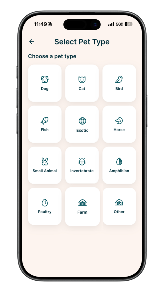 You can make plans for any type of pet, but we have some of the most popular built into the app, including: dogs, cats, reptiles, fish, and horses. You can also choose the “other” option if your pet type is not included.